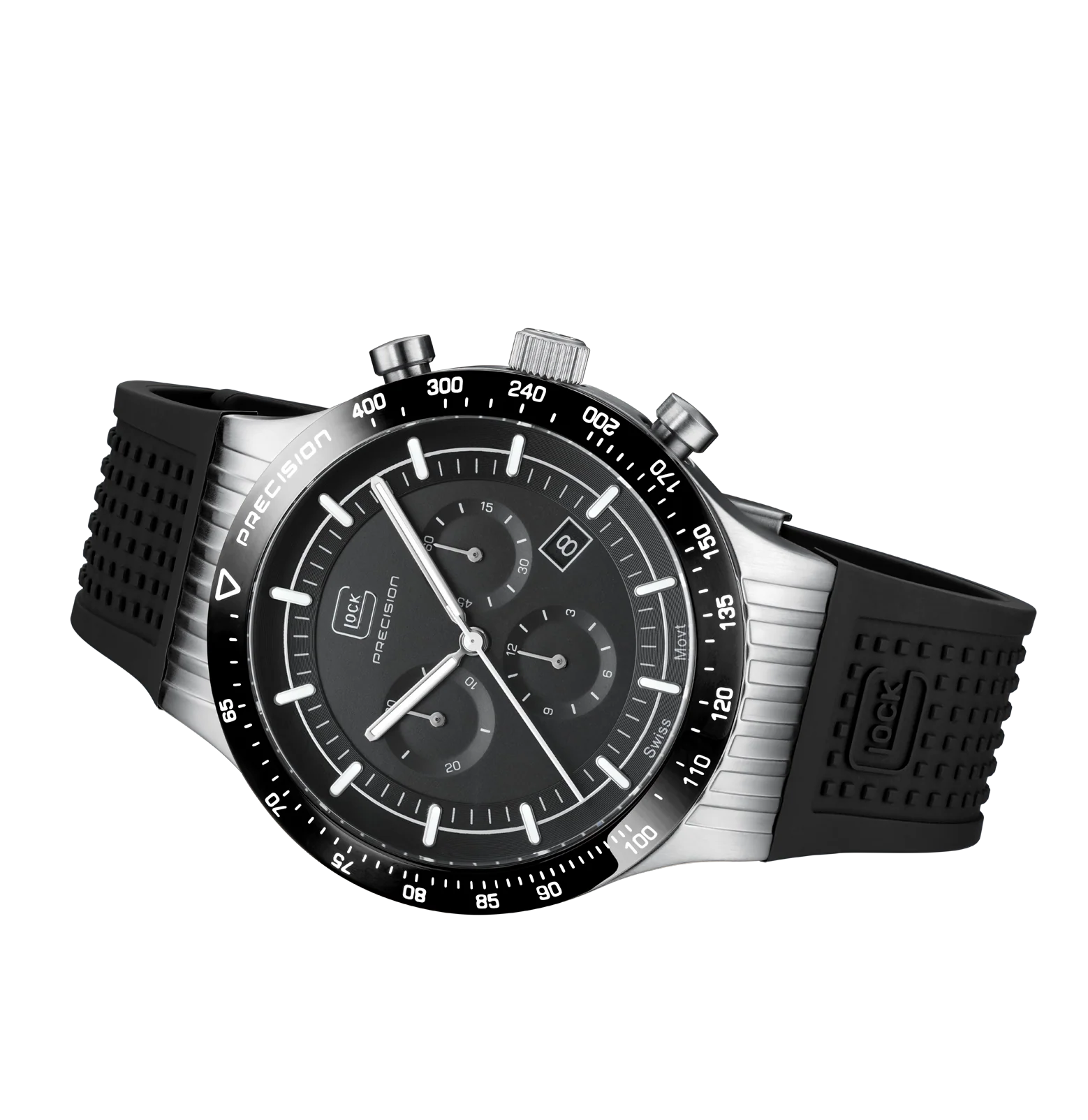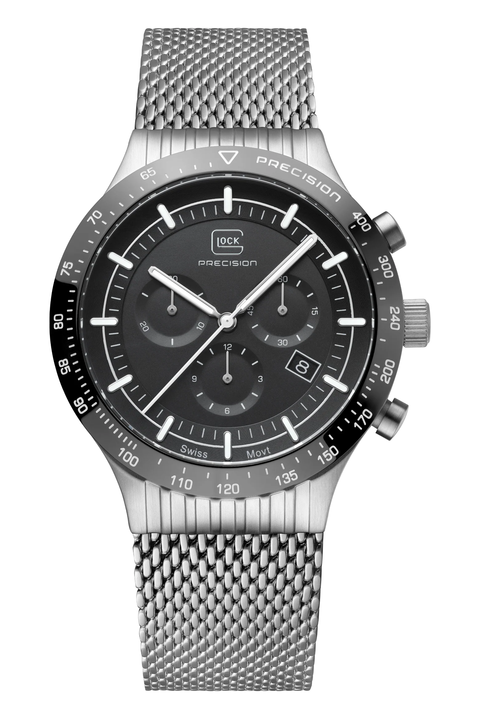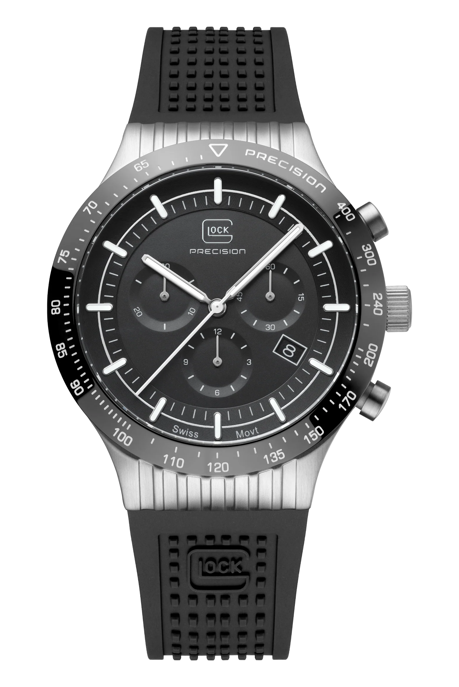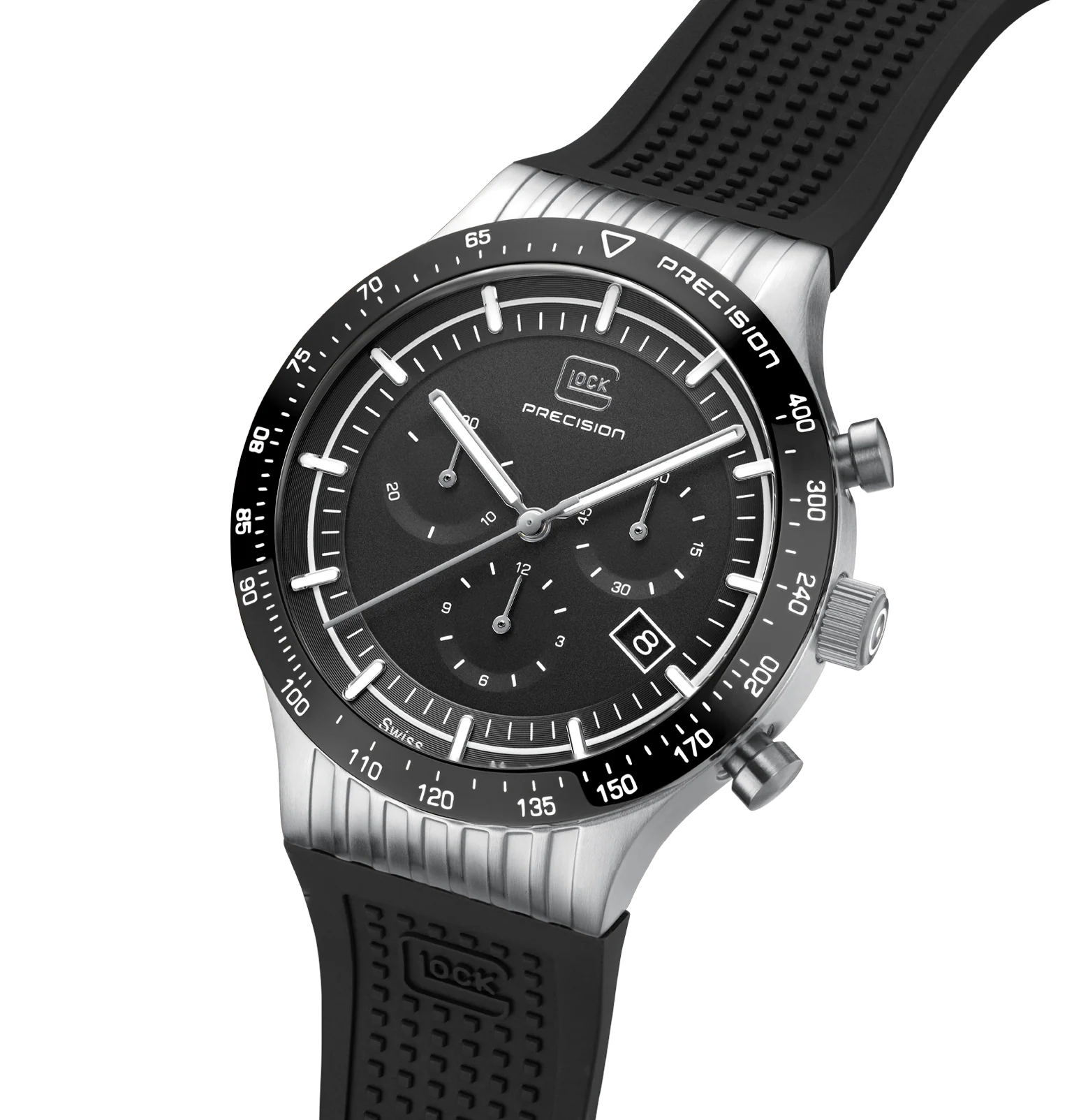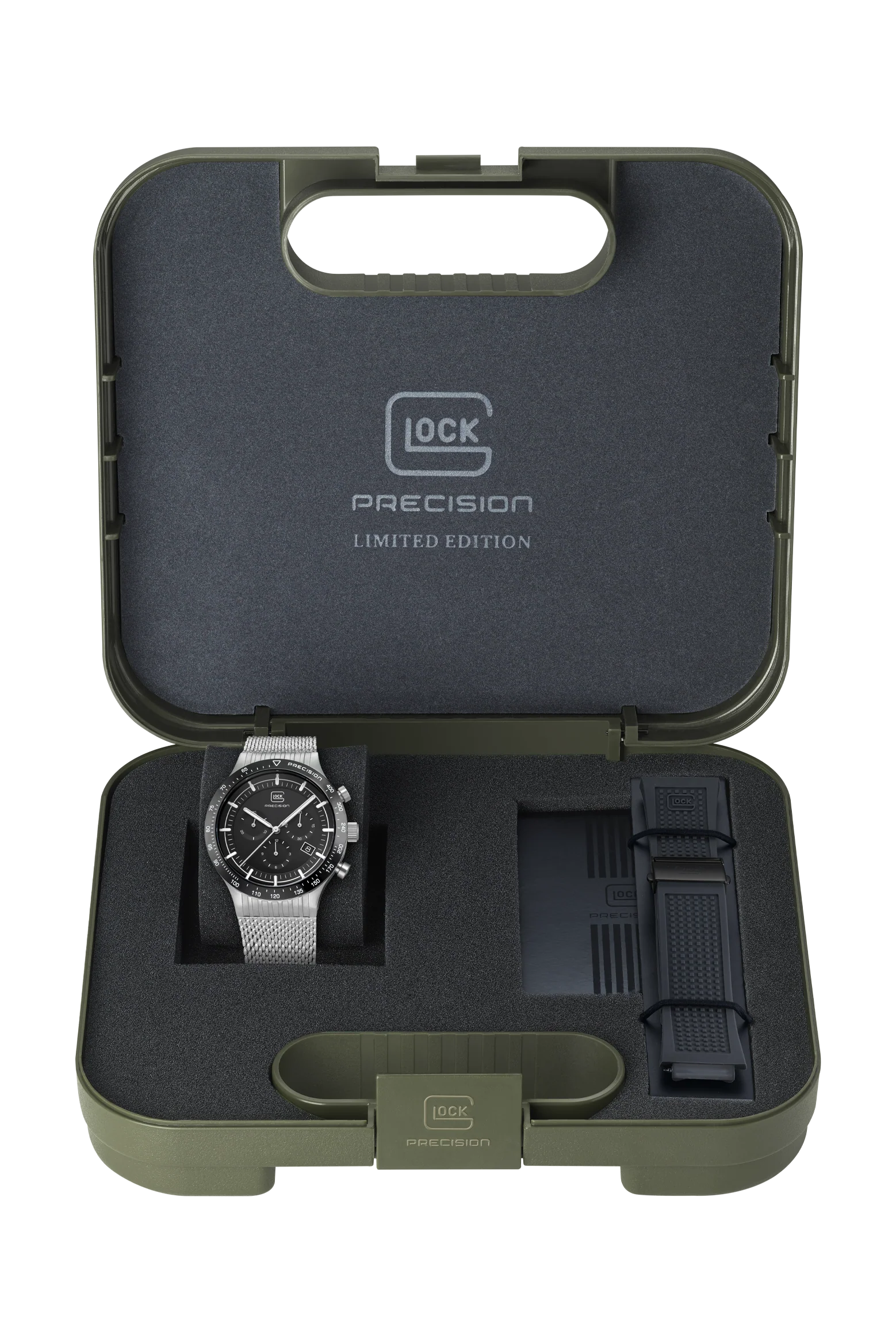 Combining durability with elegance, this 7500-piece limited-edition watch showcases a brushed silver-tone stainless steel case with a polished black bezel. Hands and indices with Swiss Super-LumiNova® ensure clear readability, while the Swiss movement and a 20 ATM water-resistance rating ensure precision and reliability. To offer versatility of style, each order includes two interchangeable straps: a black silicone strap with GLOCK's RTF texture and a silver-tone stainless steel mesh strap.