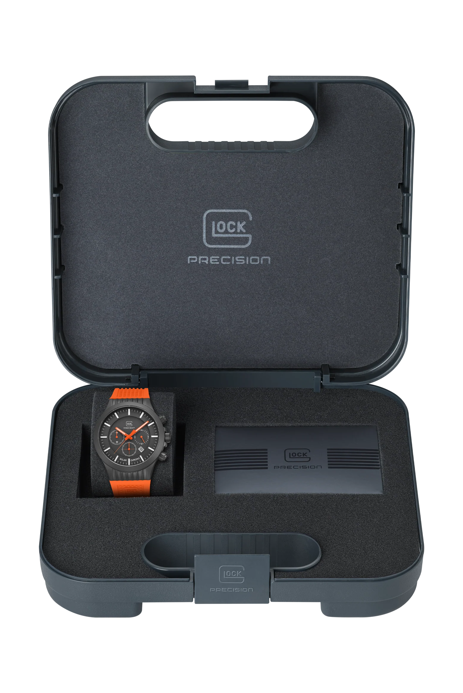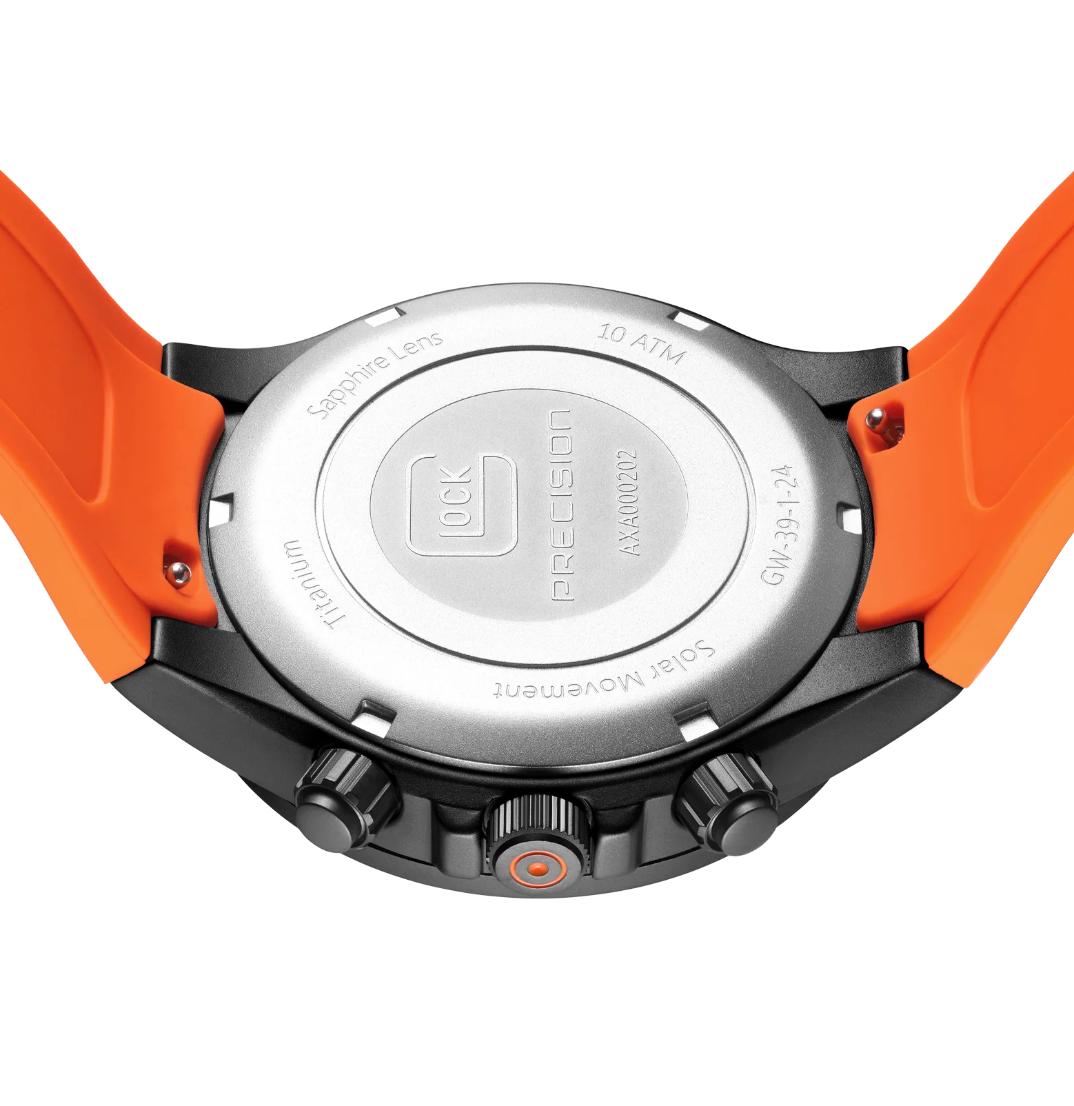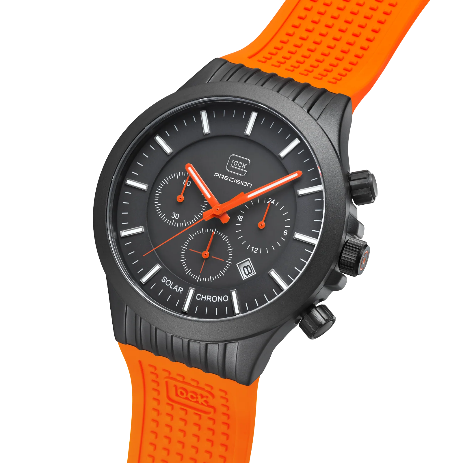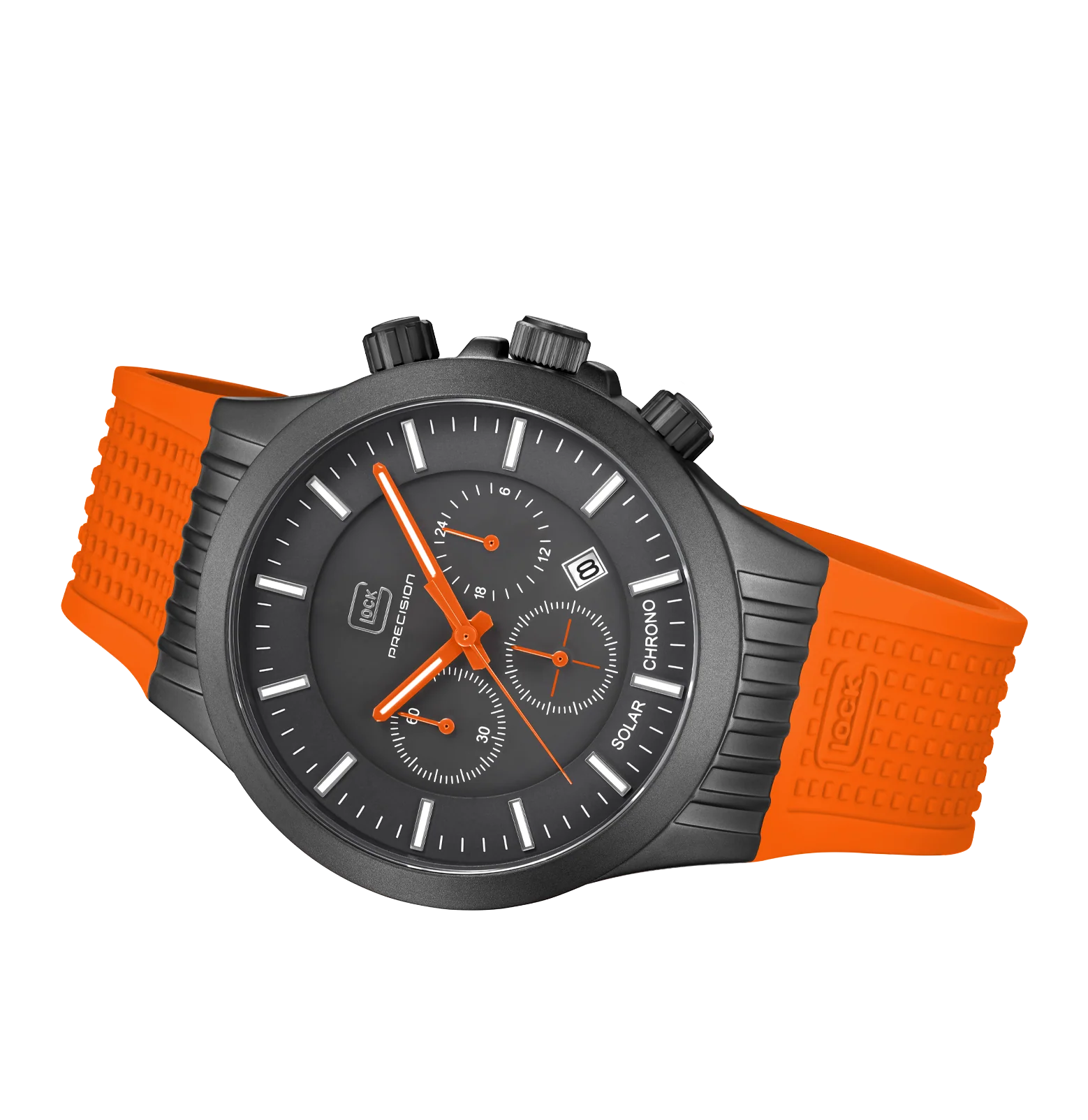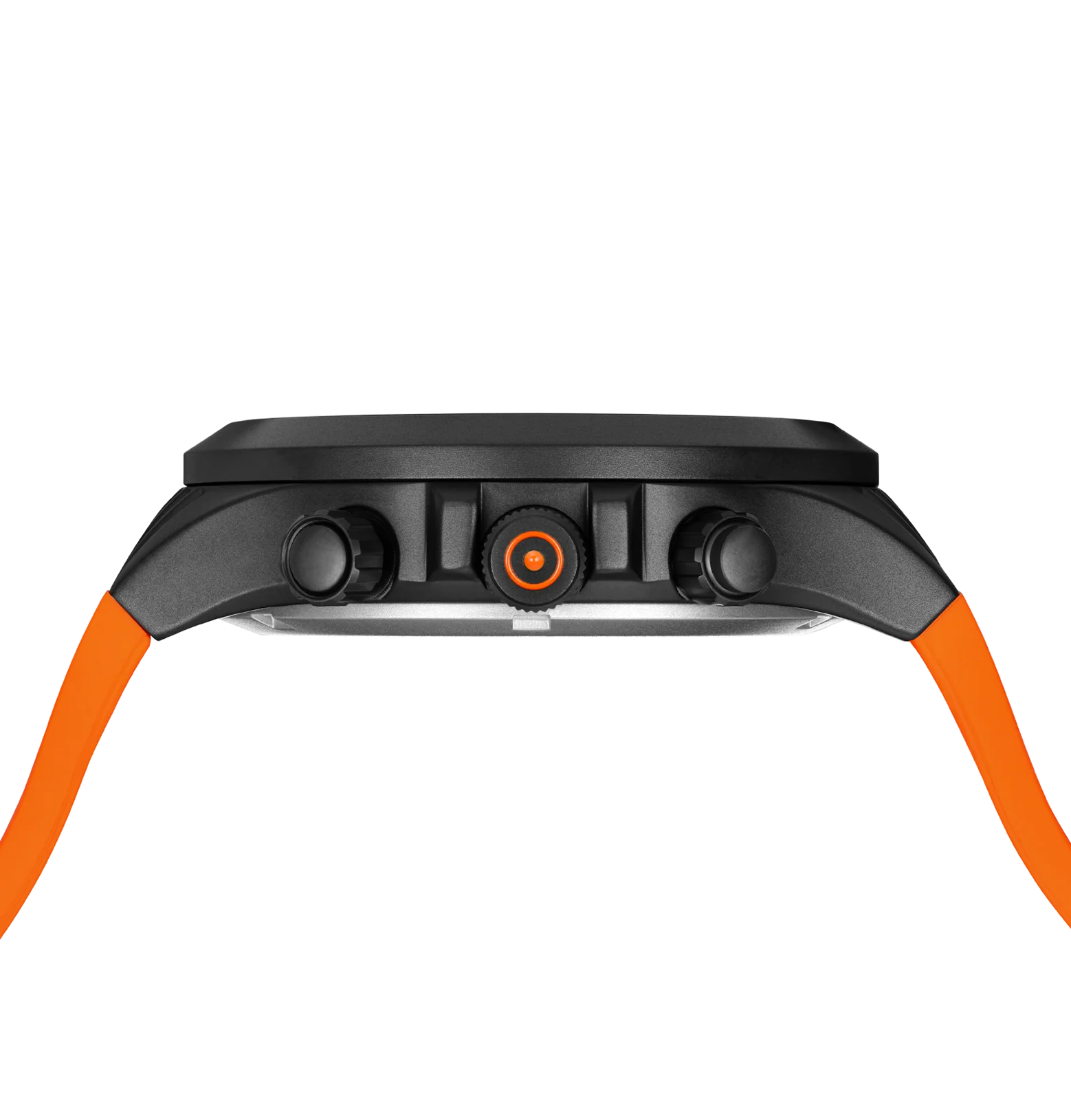 Elegant design combined with technical features. Framed in black sandblasted stainless steel, the black dial in combination with the bright orange RTF-textured silicone strap give the watch a sporty appearance. Hands with Swiss Super-LumiNova® ensure clear readability, while the orange hands add a striking accent. Powered by a solar movement, this watch features a chronograph function and a 10 ATM water-resistance rating, presenting high-quality design without compromising on technology.