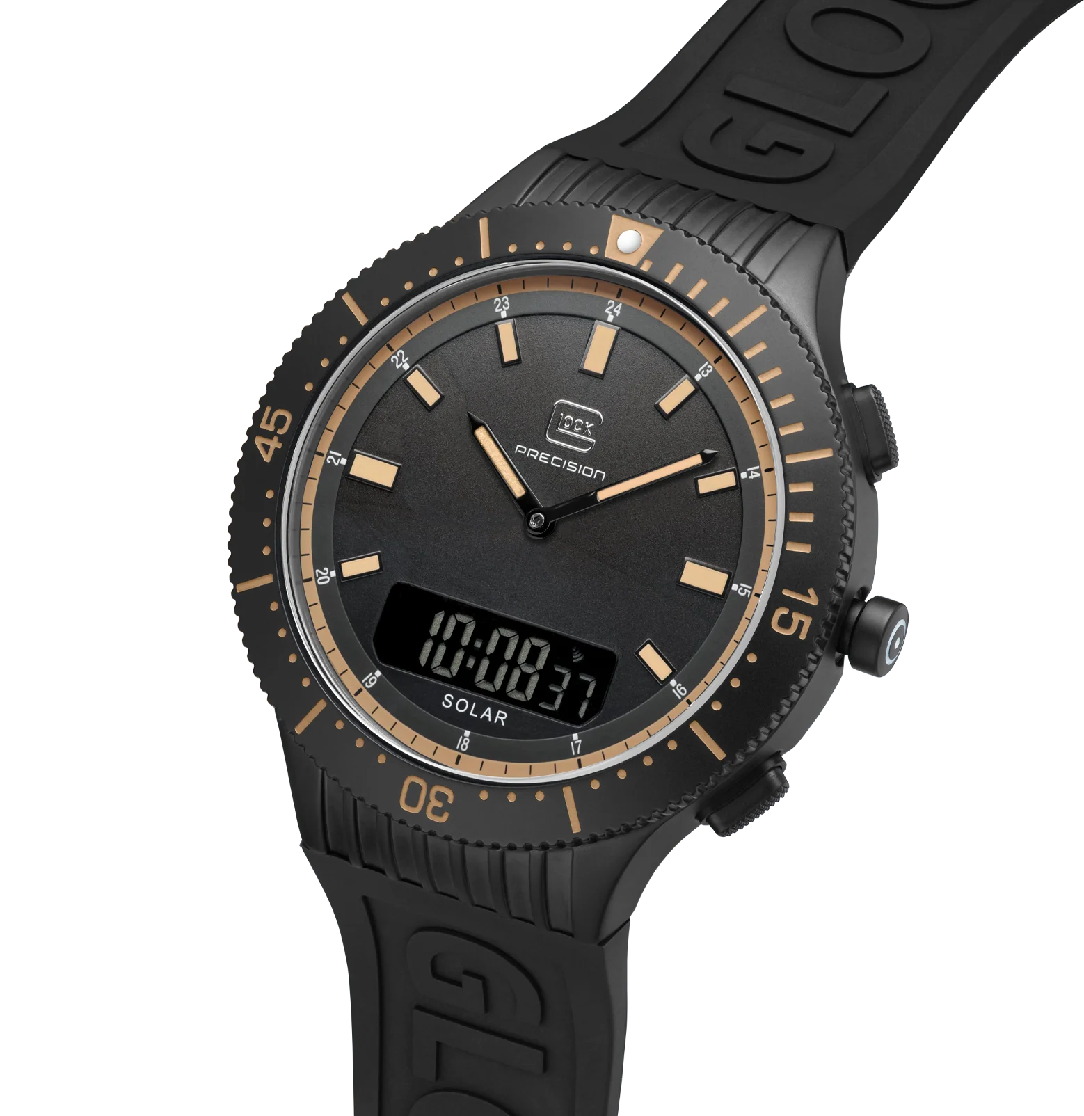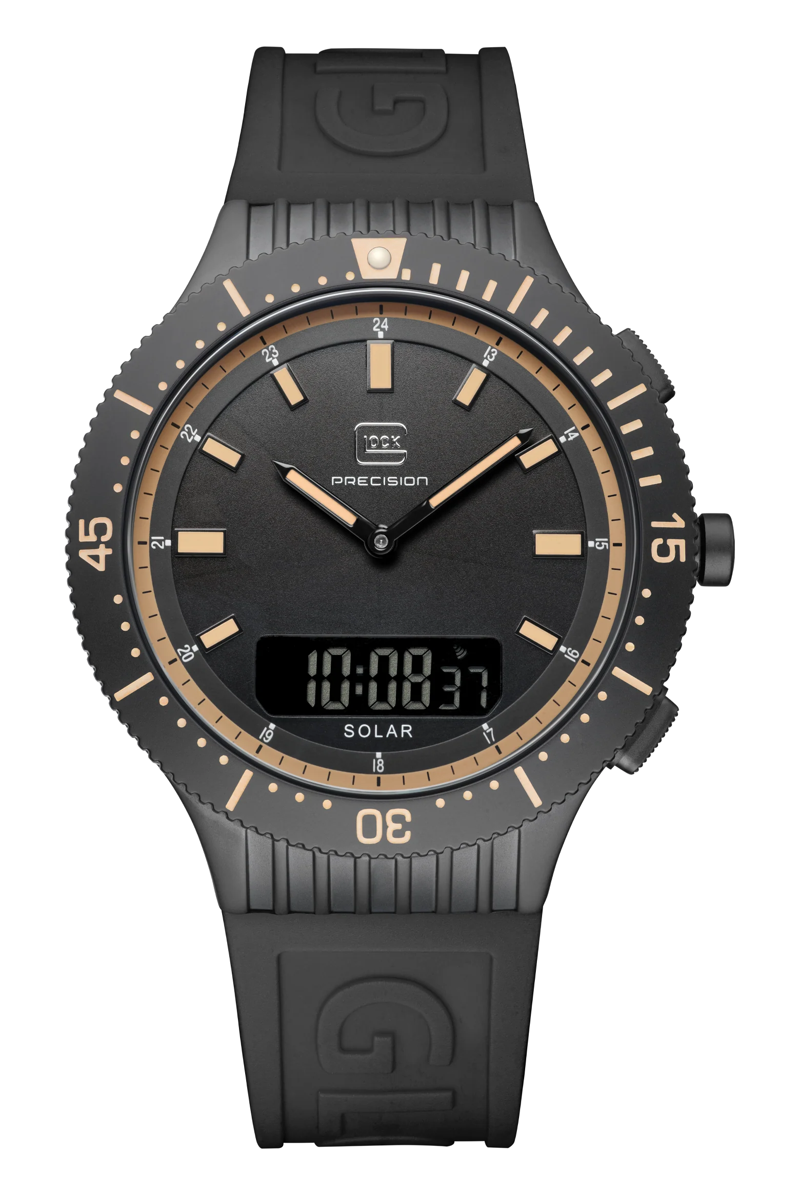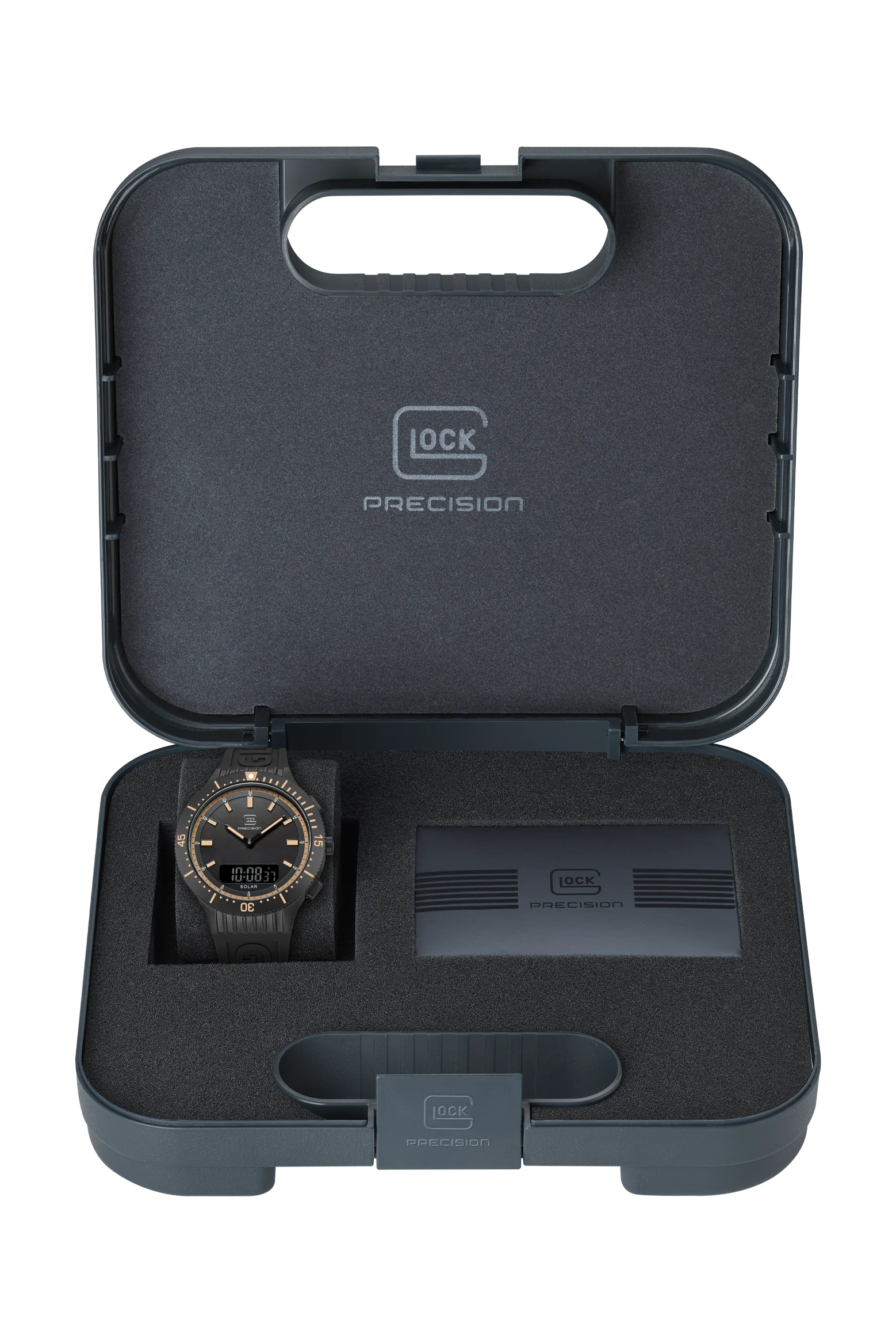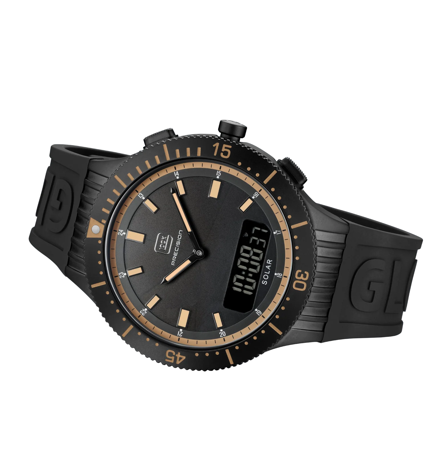 This watch blends tradition and a modern touch. Its black stainless steel case complements the color-coordinated silicone strap that features GLOCK lettering. The black dial, distinguished by the contrasts of indices and hands featuring Swiss Super-LumiNova®, is safeguarded by scratch-resistant sapphire crystal. Powered by a solar movement, the digital/analog combination ensures precision. With a 5 ATM water-resistance rating and an additional chronograph function, it’s perfect for versatile everyday use.