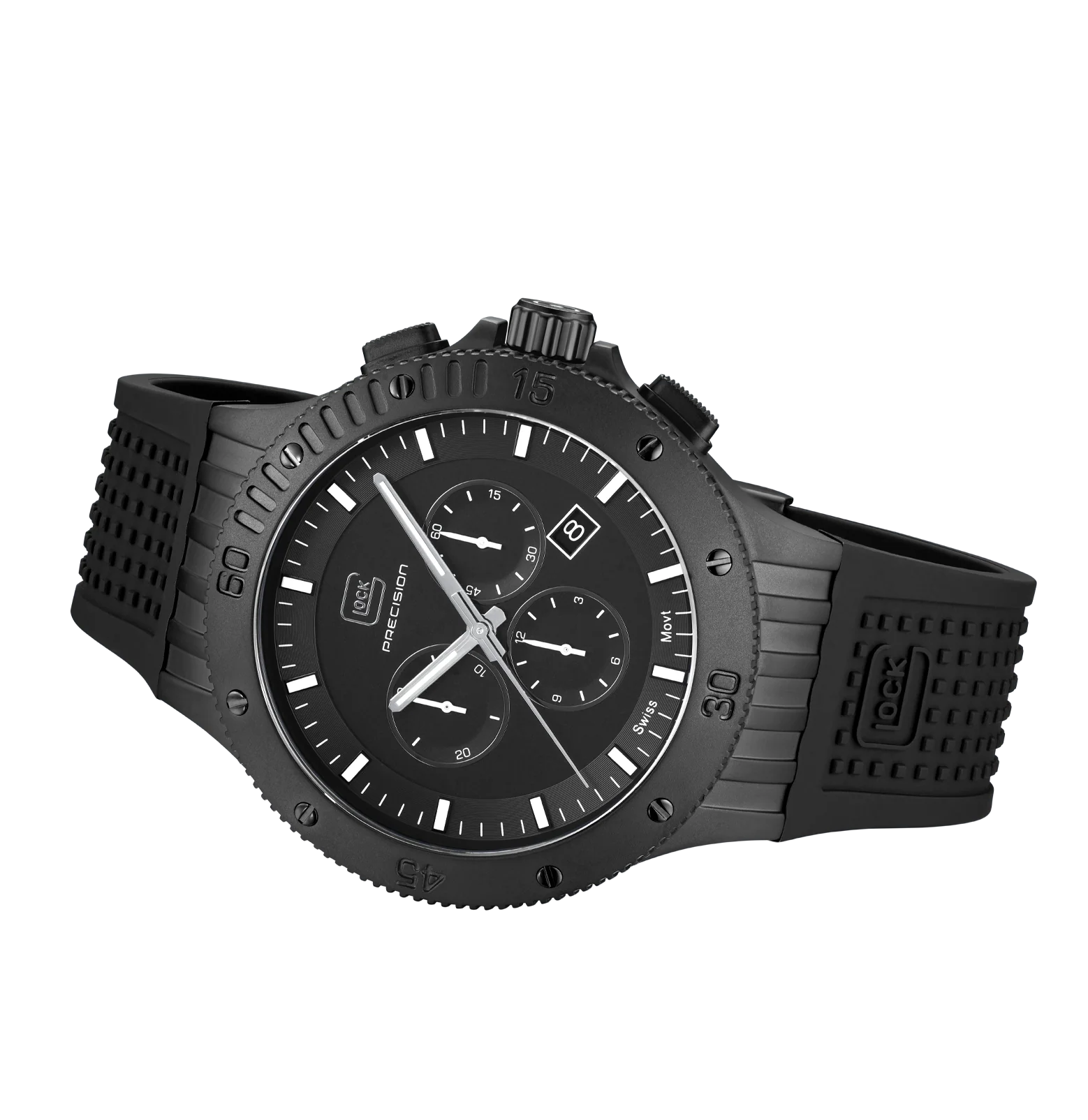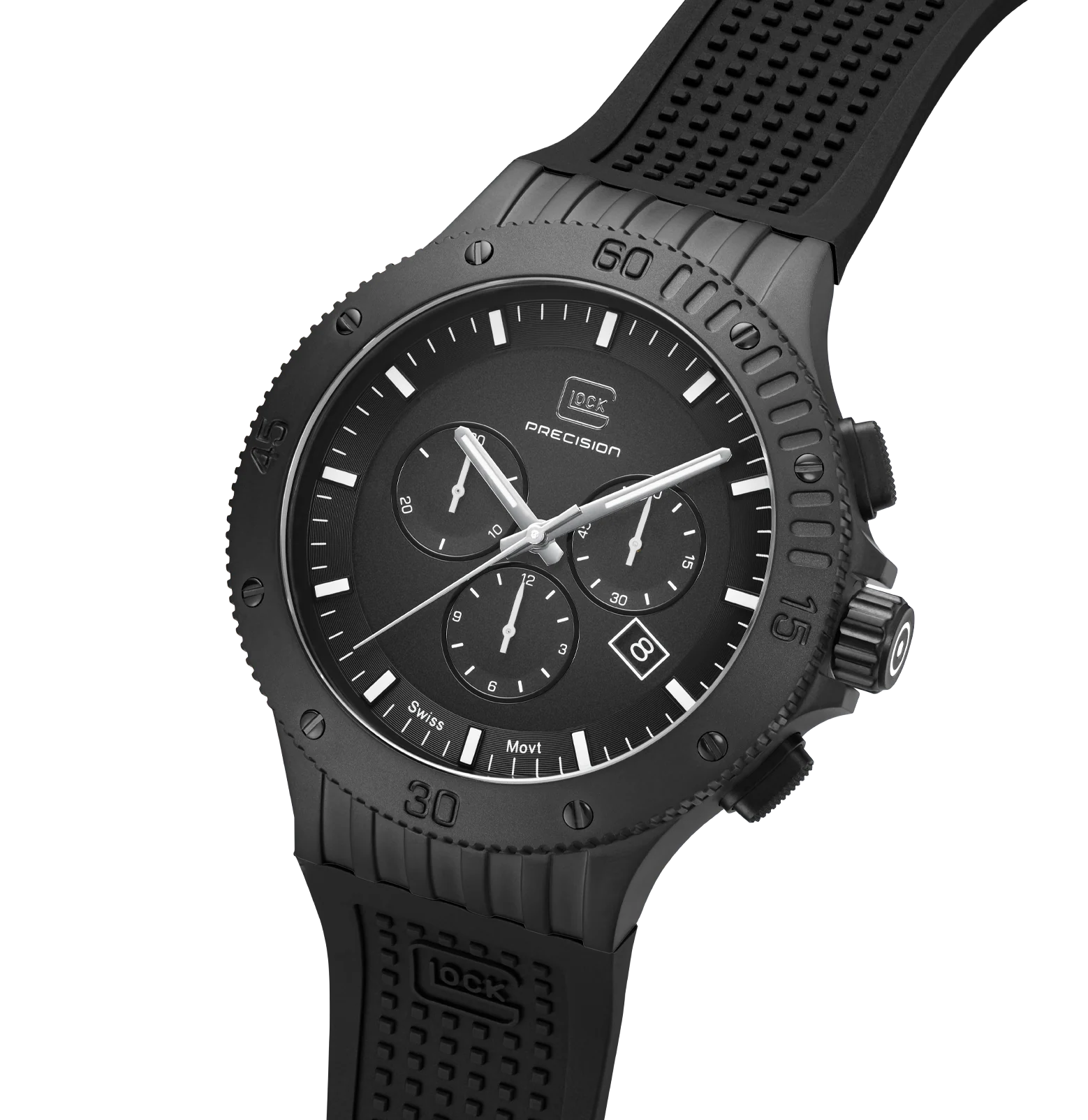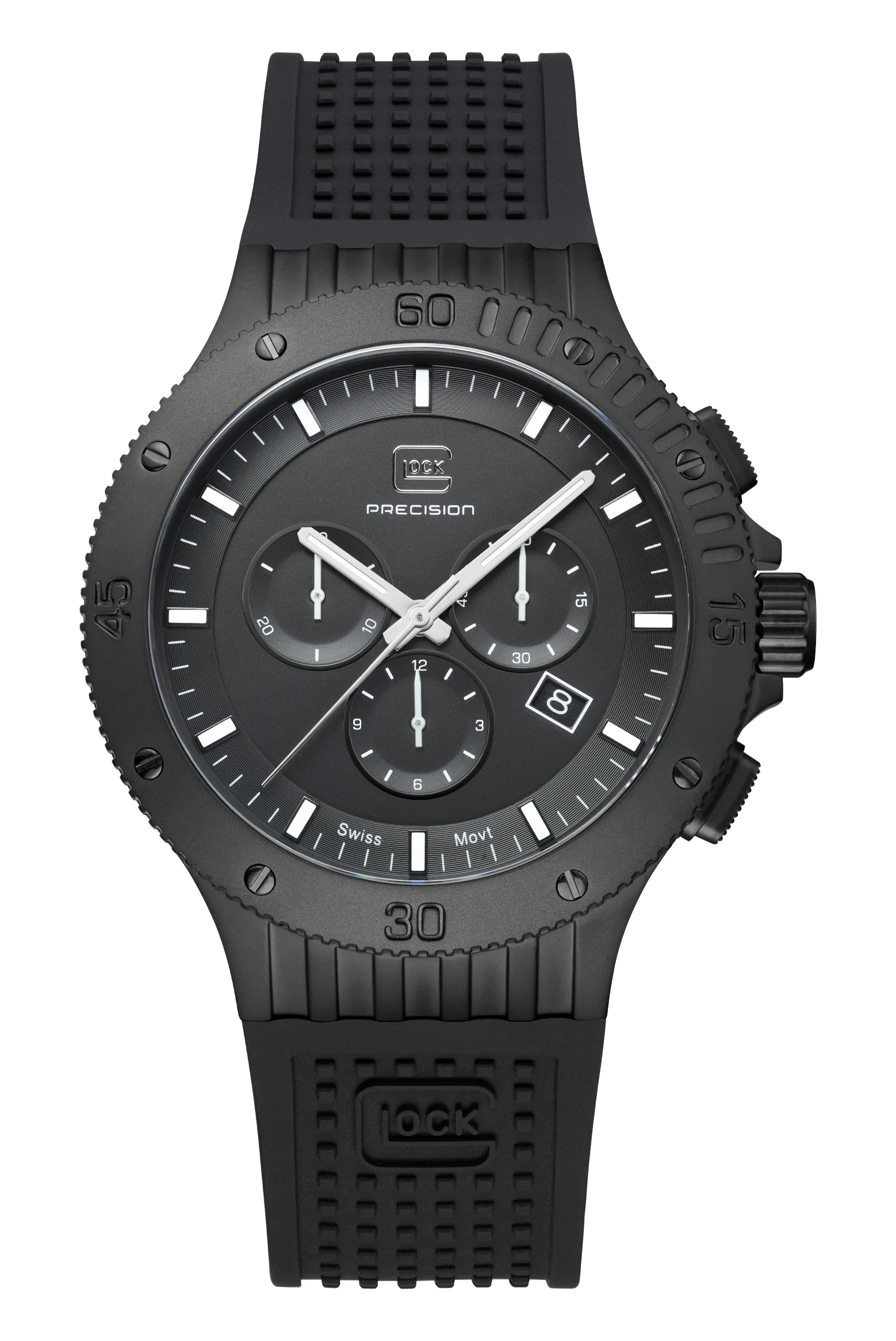 This watch combines precision and style. Its elegant black stainless steel case complements the matching silicone strap with GLOCK's RTF texture. The black dial, accentuated by silver-tone hands and indices with Swiss Super-LumiNova®, is protected by resilient sapphire crystal. Powered by a Swiss movement, it guarantees reliability and accuracy. Accompanied by a chronograph and a 20 ATM water-resistance rating, this timepiece is certain to be a versatile companion for adventures.