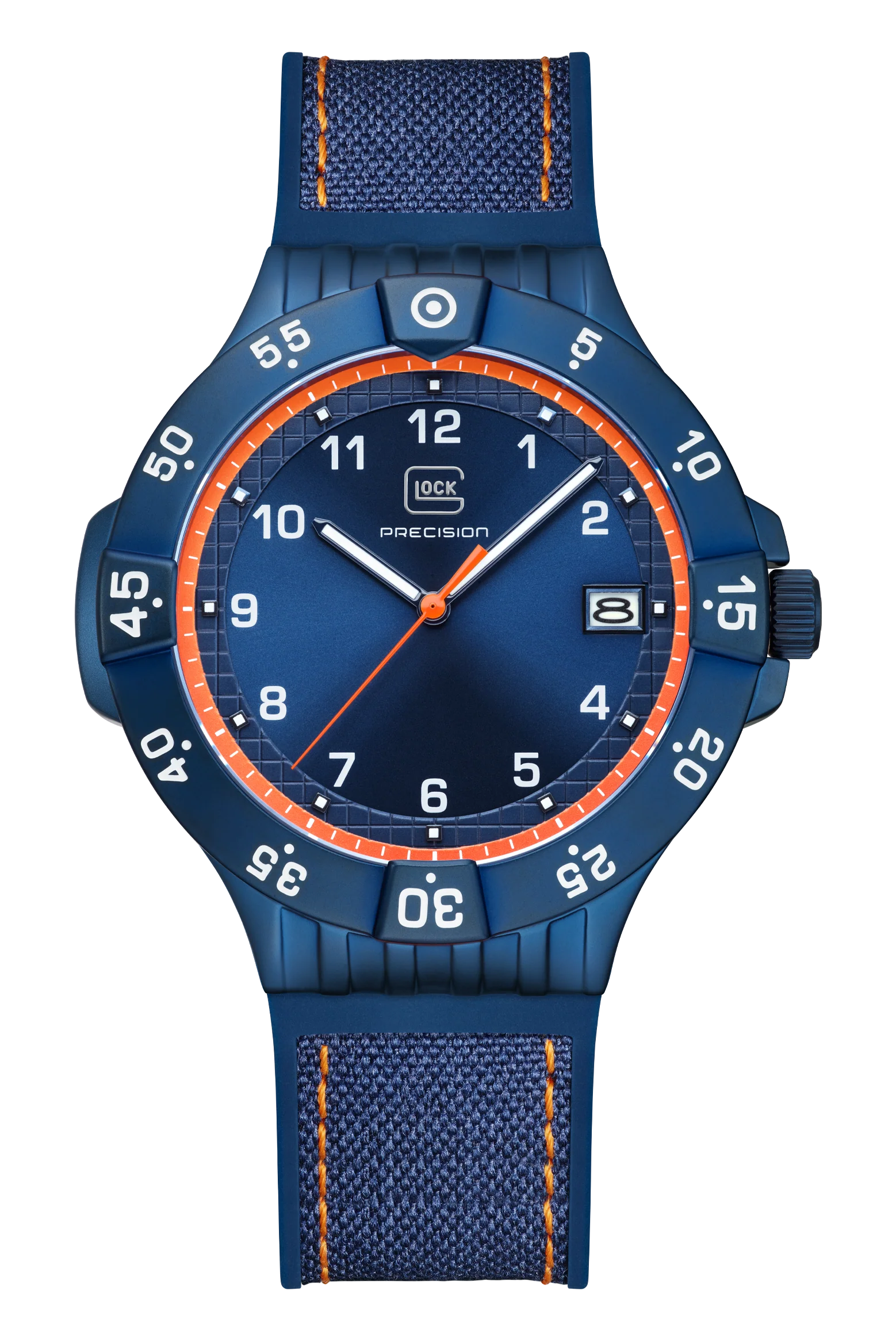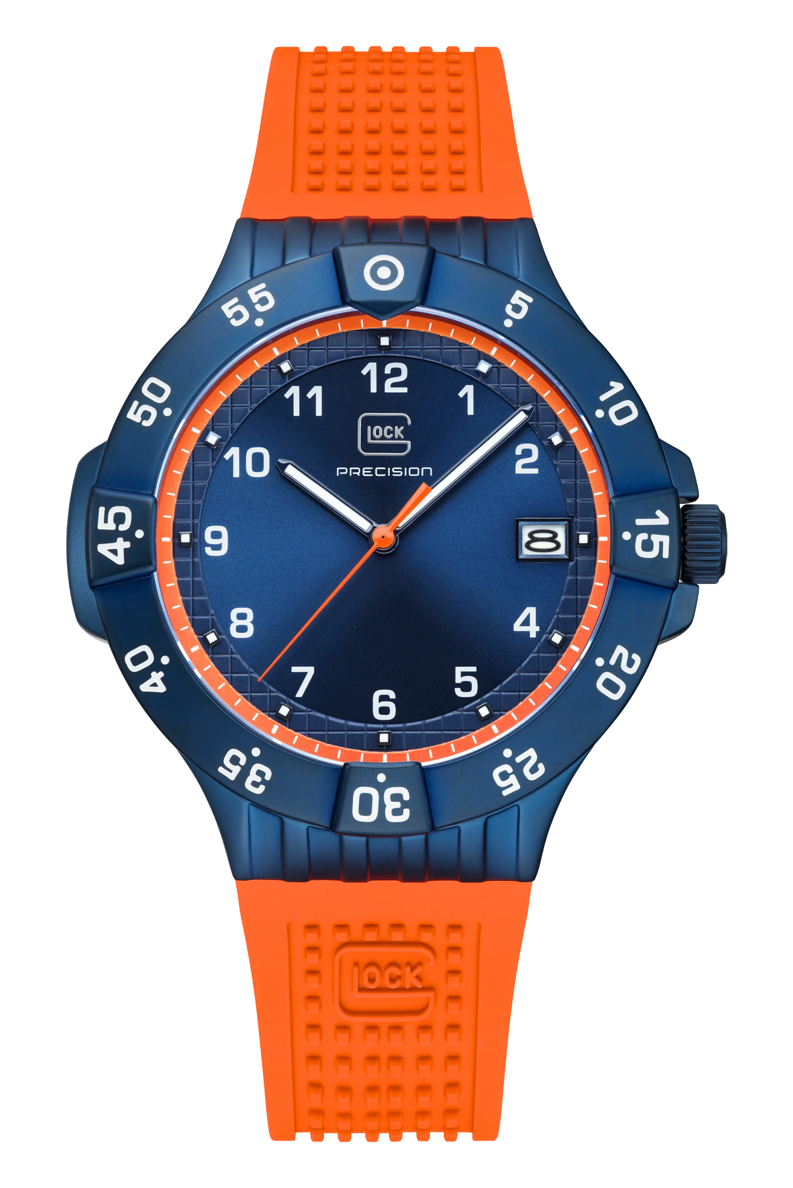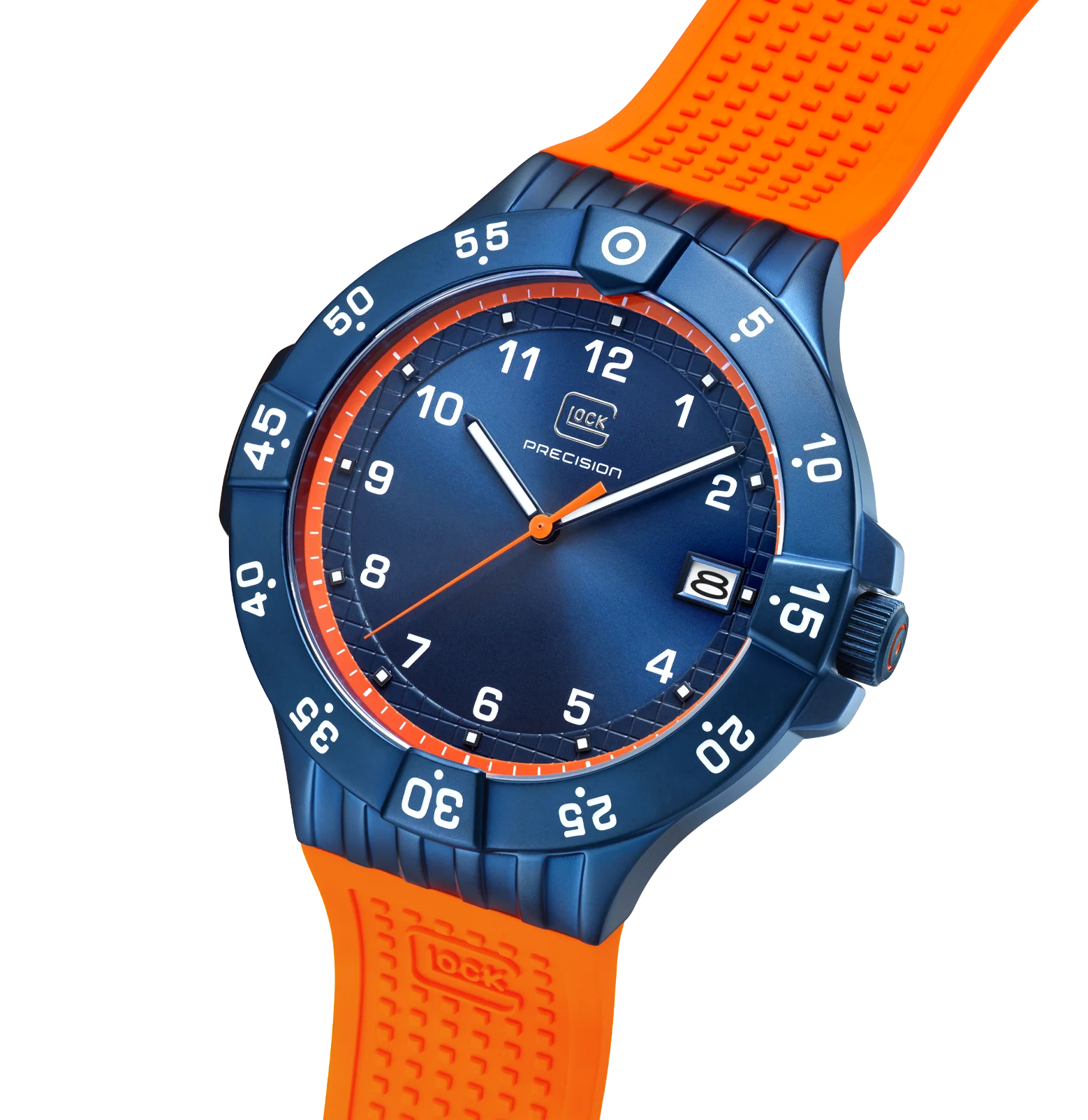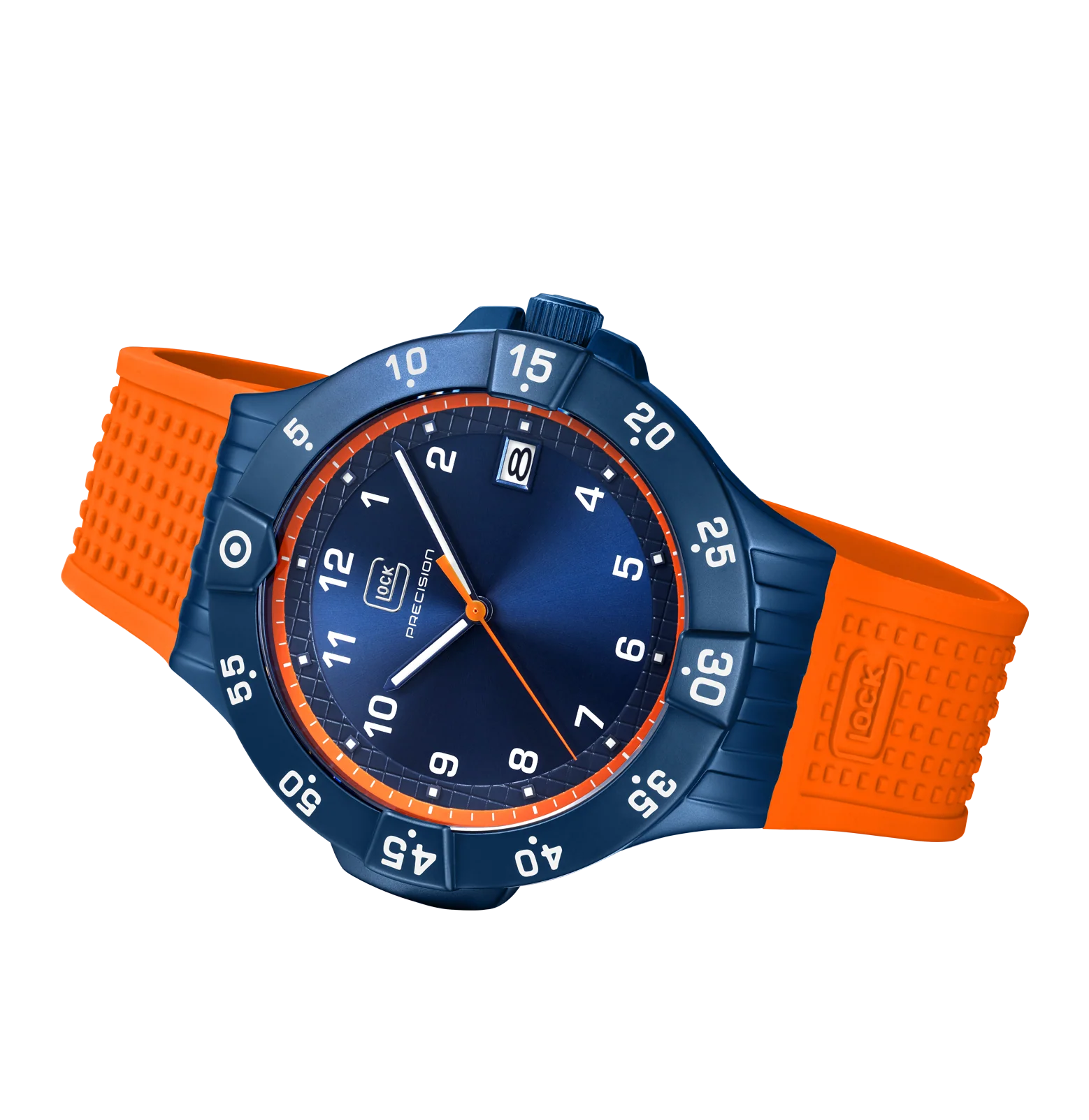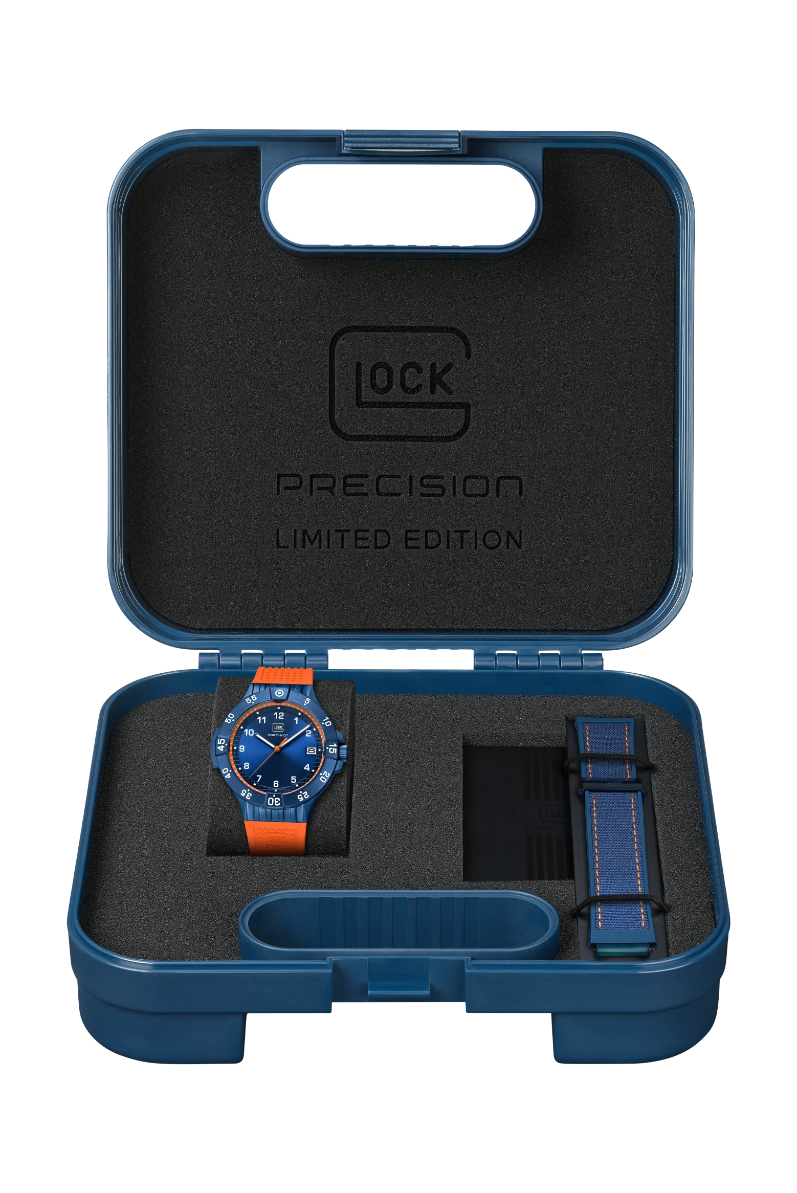 This 5000-piece limited-edition wristwatch symbolizes precision craftsmanship. Encased in a blue stainless steel housing, the blue dial with orange accents features hands and indices with Swiss Super-LumiNova® and a striking orange second hand. With a rotating bezel and rated to 10 ATM water resistance, this watch represents durability and resilience. To offer versatility of style, each order comes with two interchangeable straps: a orange silicone strap with GLOCK's RTF texture and a all new blue rubber textile strap with orange stitching.