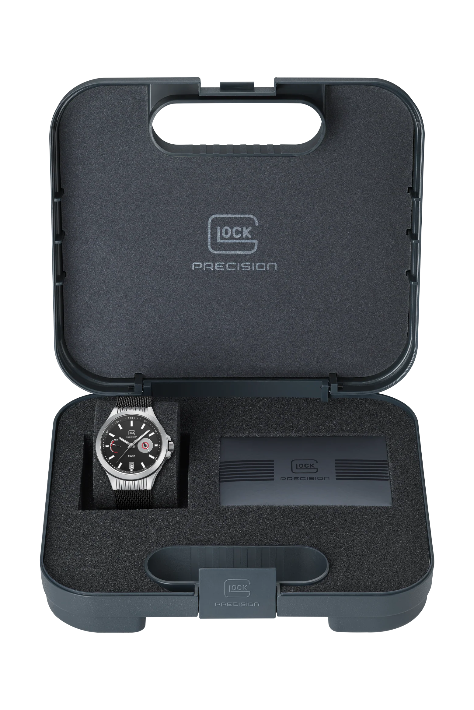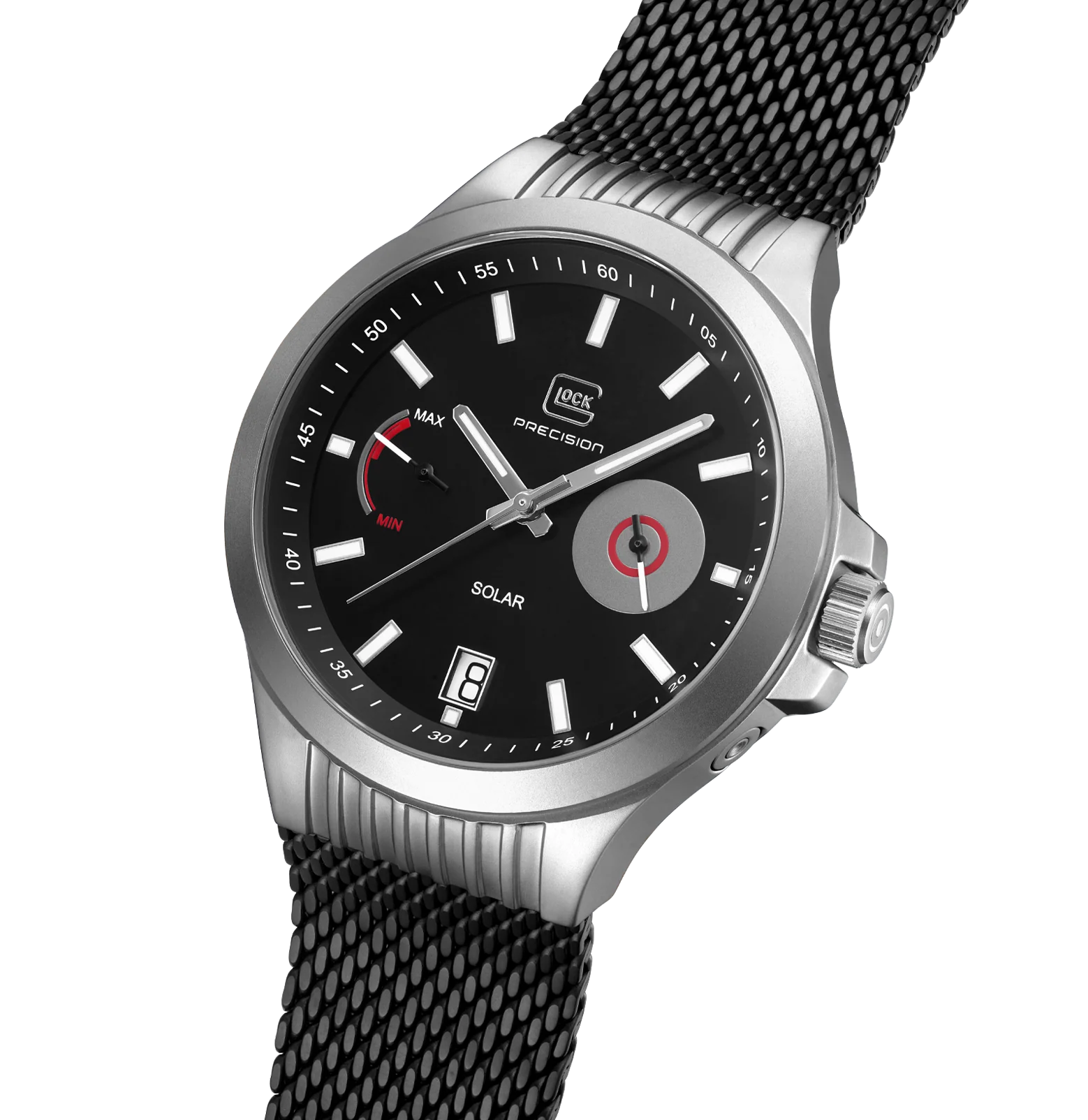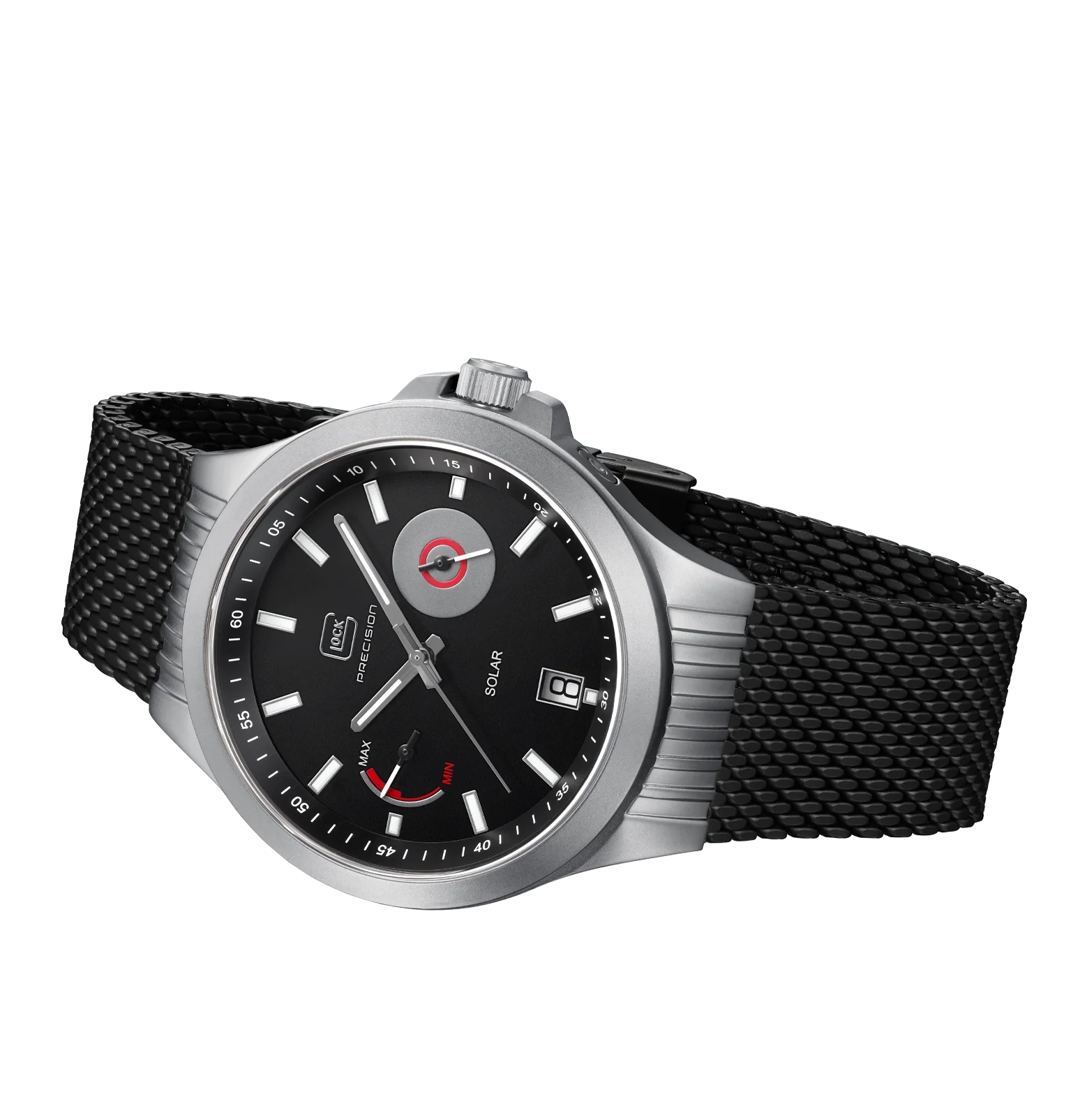 A combination of precision and functionality. The stainless-steel case encloses a deep black dial illuminated by indices and hands with Swiss Super-LumiNova®. A standout feature of the dial is the power reserve indicator, ensuring you always have insight into your watch's solar energy status, accompanied by the distinctive detail of a bullet casing with red accents. Complemented by a sturdy stainless steel mesh strap, powered by a reliable solar movement, and rated to 10 ATM water resistance, this watch represents sophisticated design and technical precision.