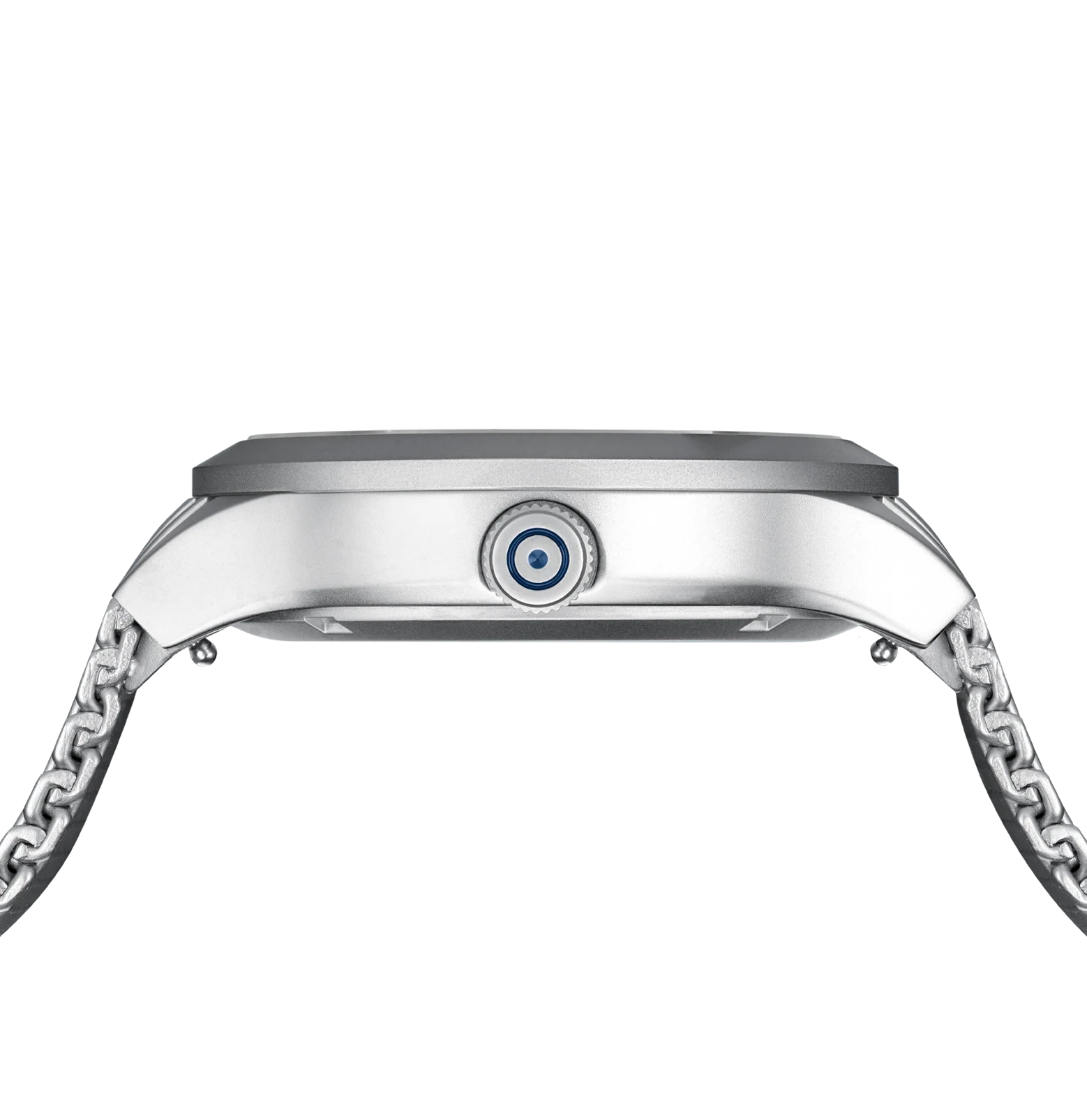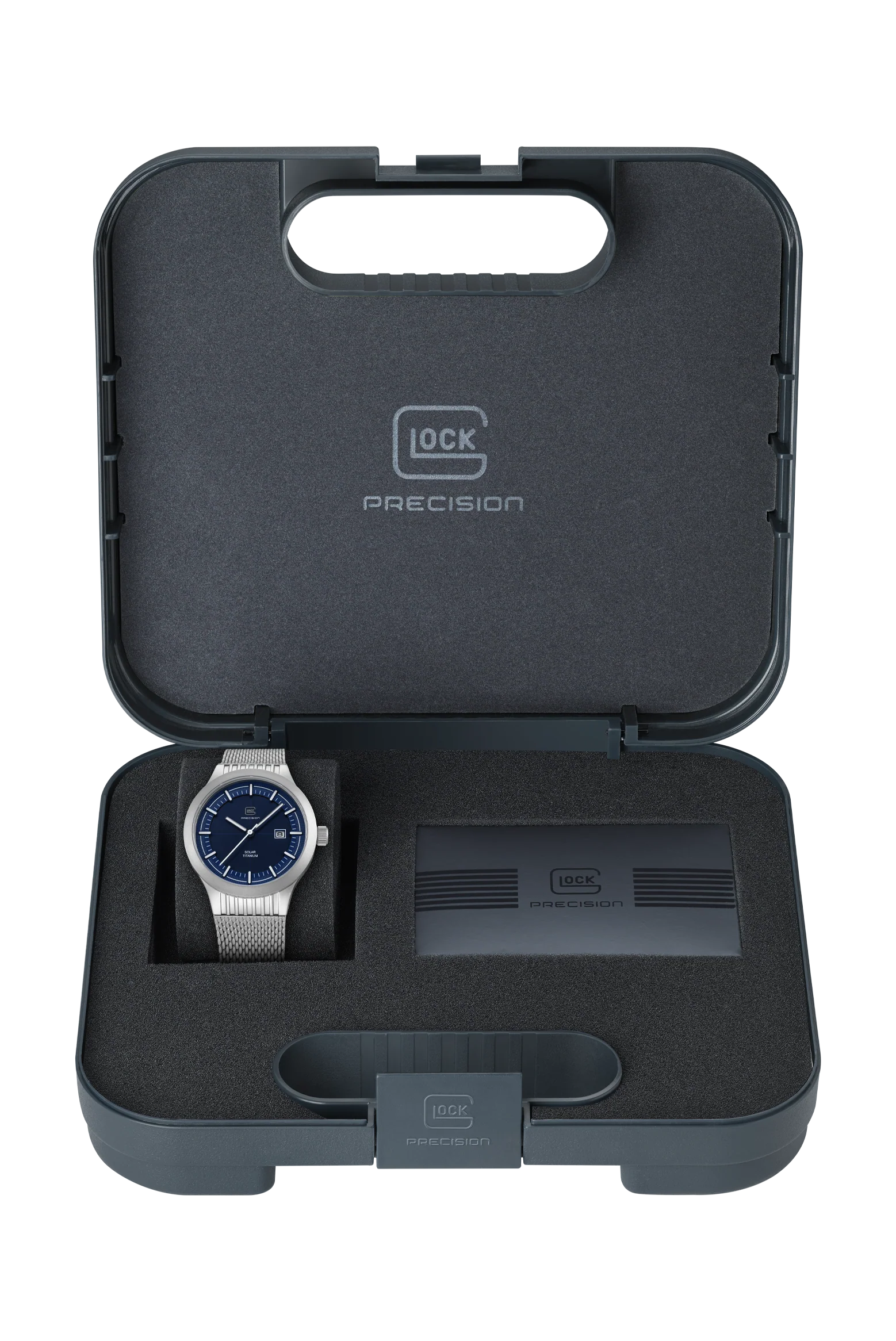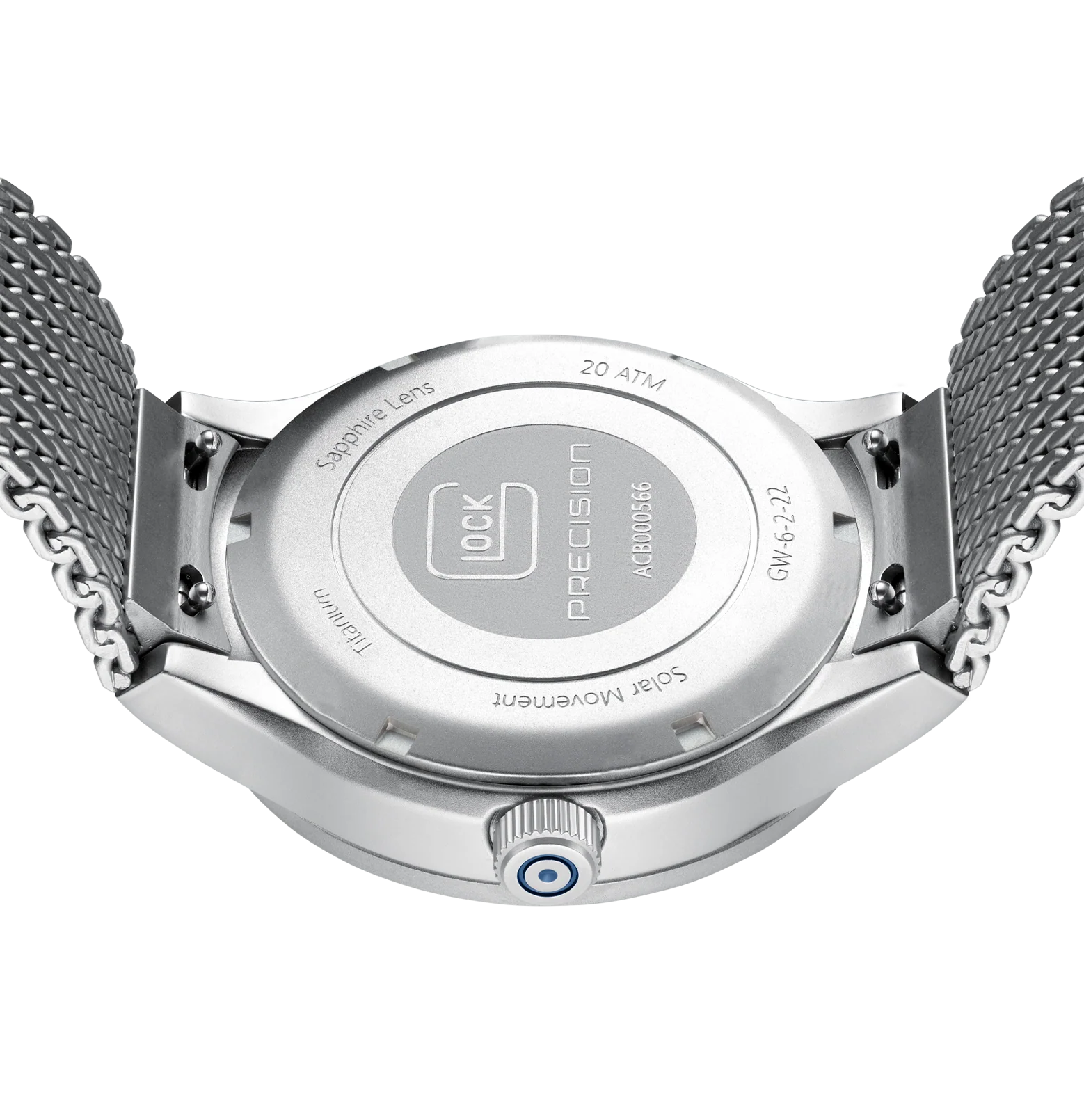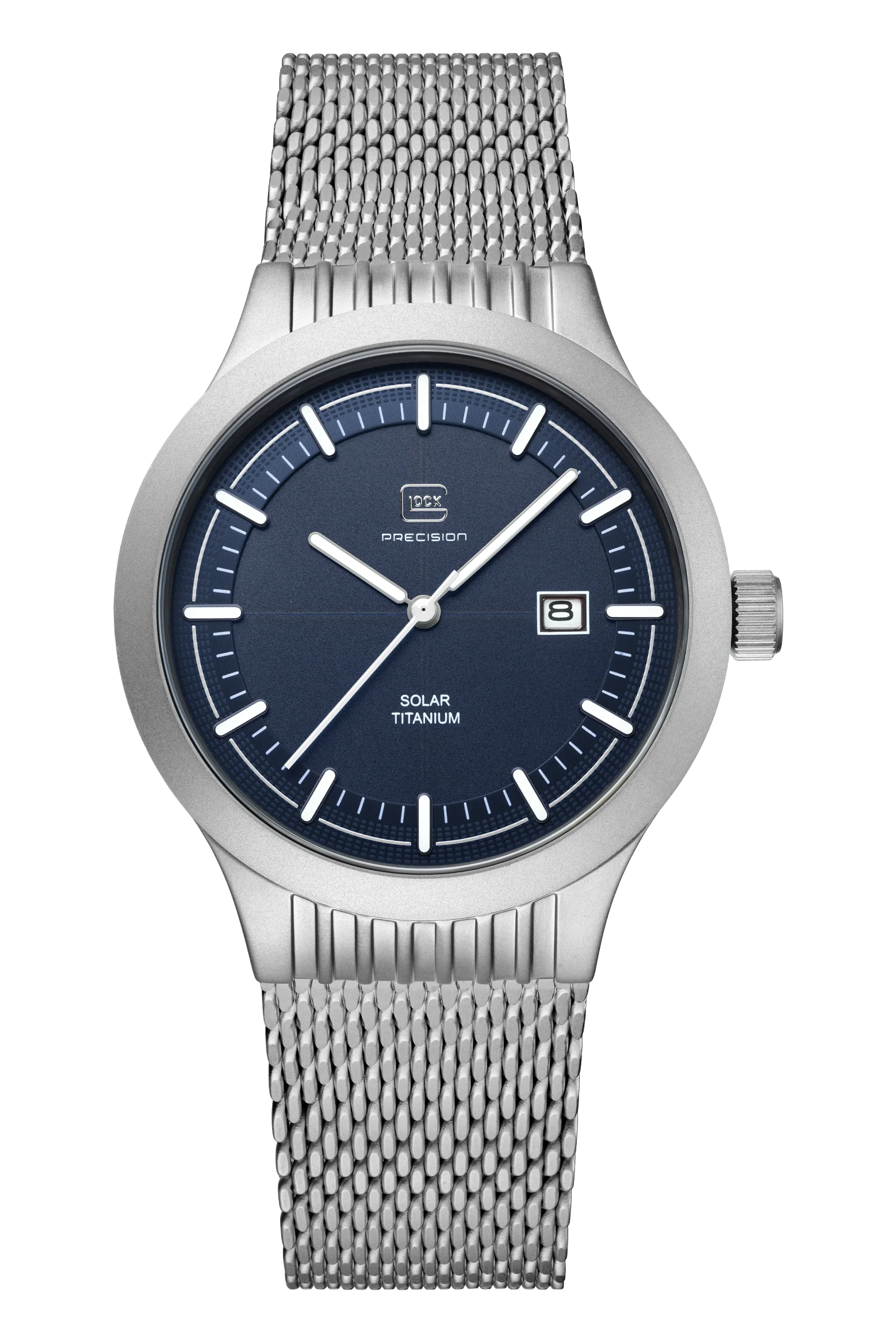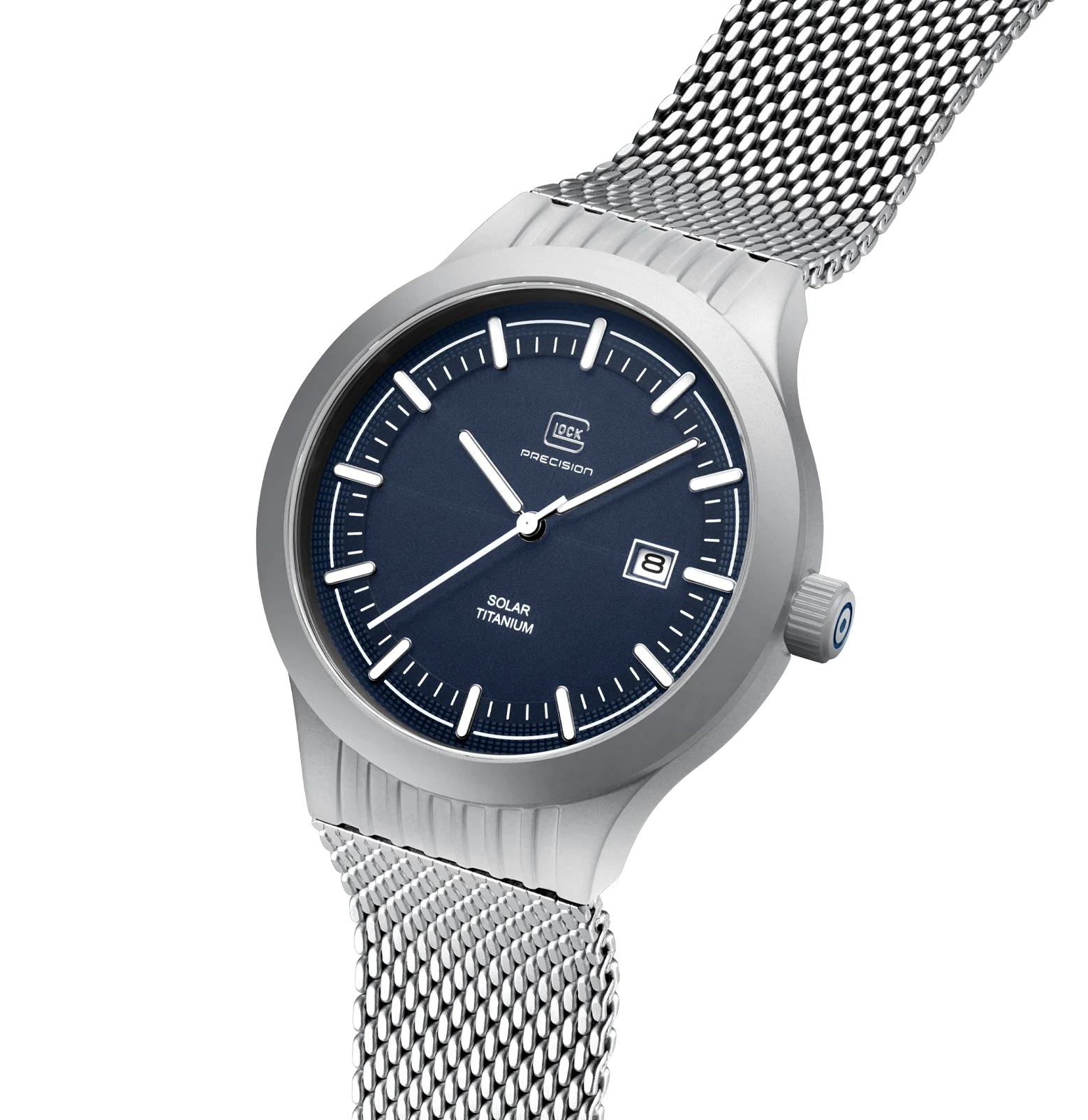 A combination of precision and modern flair. The sandblasted titanium case encloses a deep blue dial illuminated by indices and hands with Swiss Super-LumiNova®. A white accent ring discreetly highlights the graphic elements on the outer edge of the dial, reminiscent of GLOCK's RTF texture. Complemented by a sturdy stainless steel mesh strap, powered by a reliable solar movement, and rated to 20 ATM water resistance, this watch represents sophisticated design and technical precision.