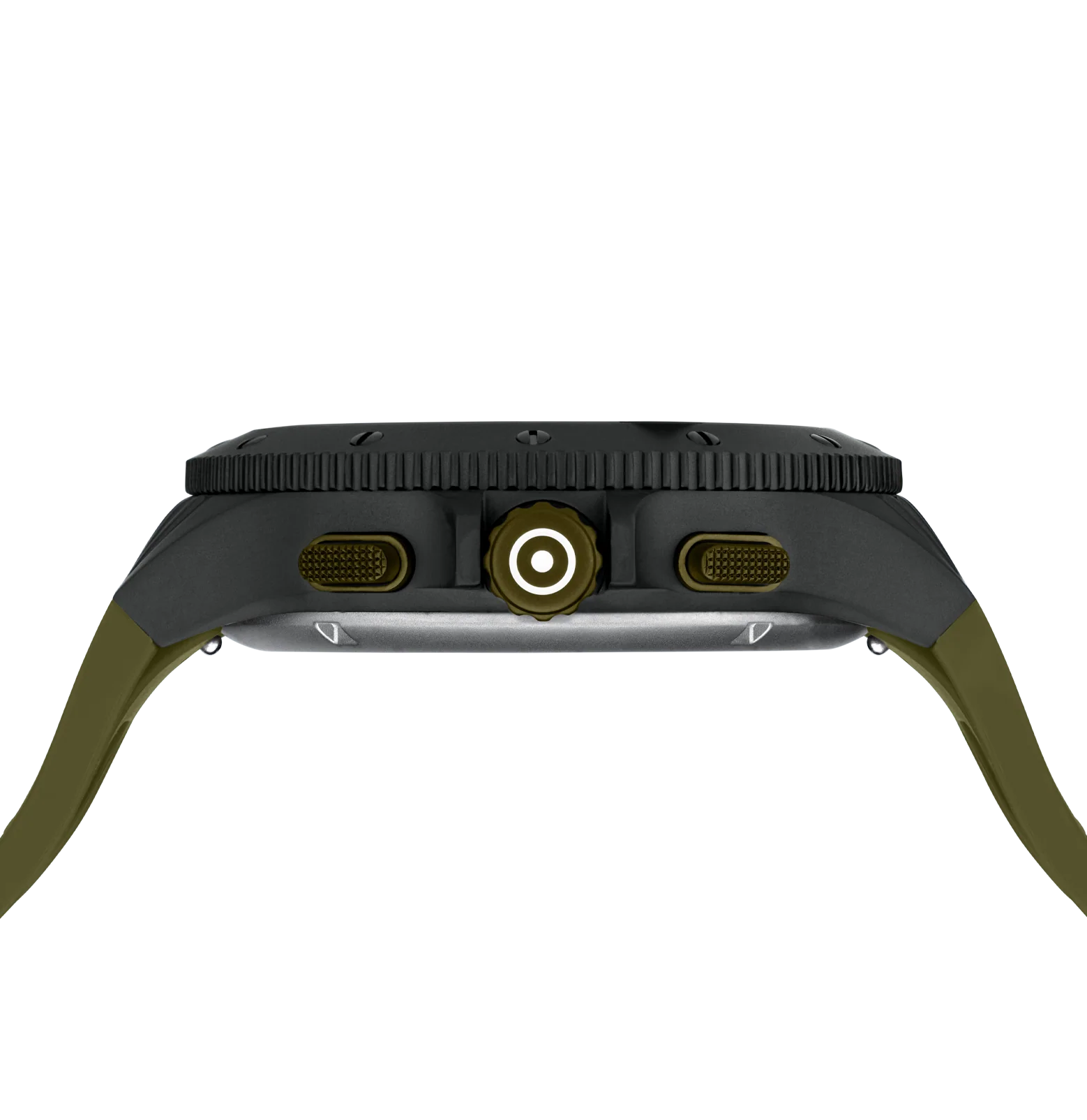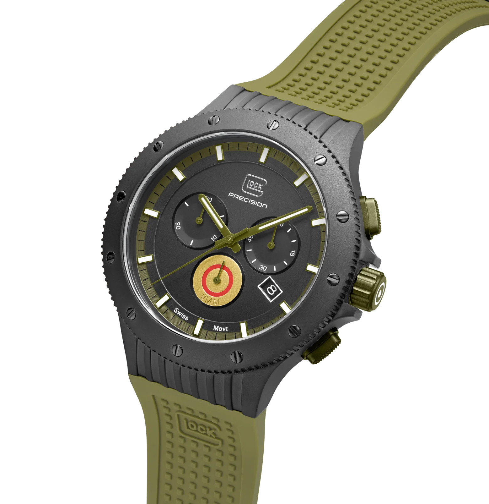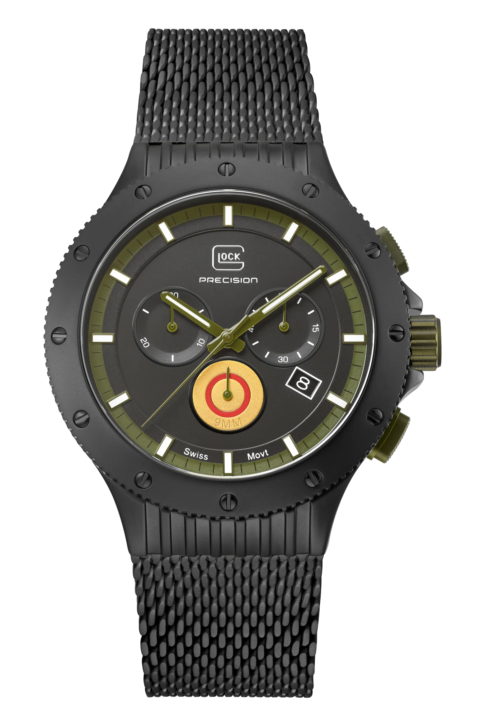This 7500-piece limited-edition wristwatch symbolizes precision craftsmanship. Its black titanium case is enriched by the distinctive detail of a bullet casing on the dial. Hands and indices with Swiss Super-LumiNova® ensure readability of the time even in low-light conditions. The watch is powered by a reliable Swiss movement, features a chronograph function, and boasts a water-resistance rating of 20 ATM. To offer versatility of style, each order comes with two interchangeable straps: a green silicone strap with GLOCK's RTF texture and a black mesh strap.